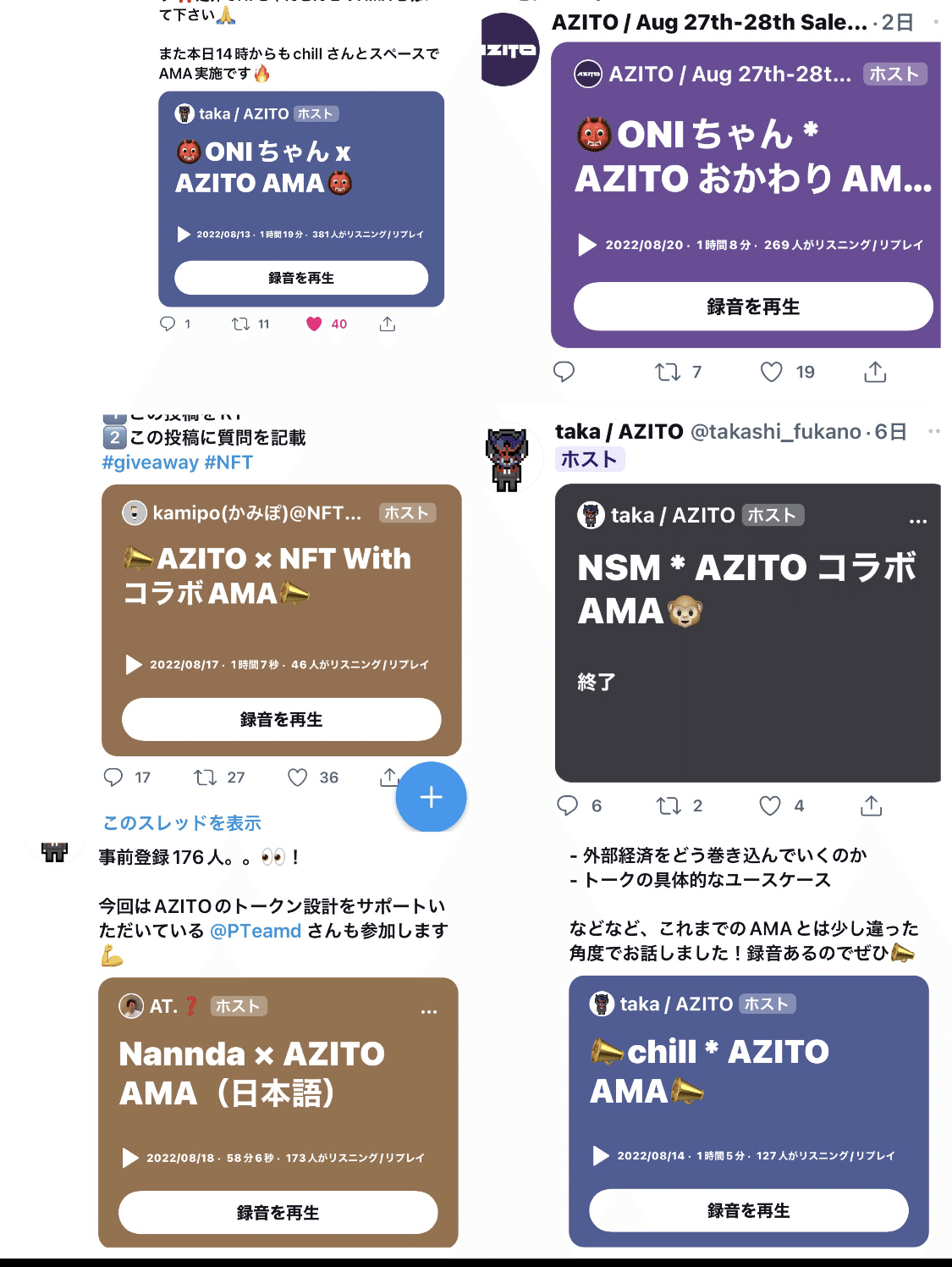 AZITOはchillさんNFT Withのかみぽさん・ゲームの部分エンジニアさんや、10,000体から3,000選ぶ実況スペースなど、1週間で6回以上AMAをしています。